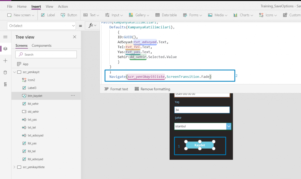 Bunun için scr_yenikayıt sayfasına gidip kaydet butonuna tıklayalım, formül barında daha önceden yazdığımız kod görünecek. o kodun sonuna aşağıda işaretlenen Navigate kodunu ekleyelim. Bu şekilde, tek buton içerisinde birden fazla eylem emri olduğunda, eylem emirlerinin arasına uygulamada kullandığınız dile bağlı olarak ; ya da ;; yazmalıyız.